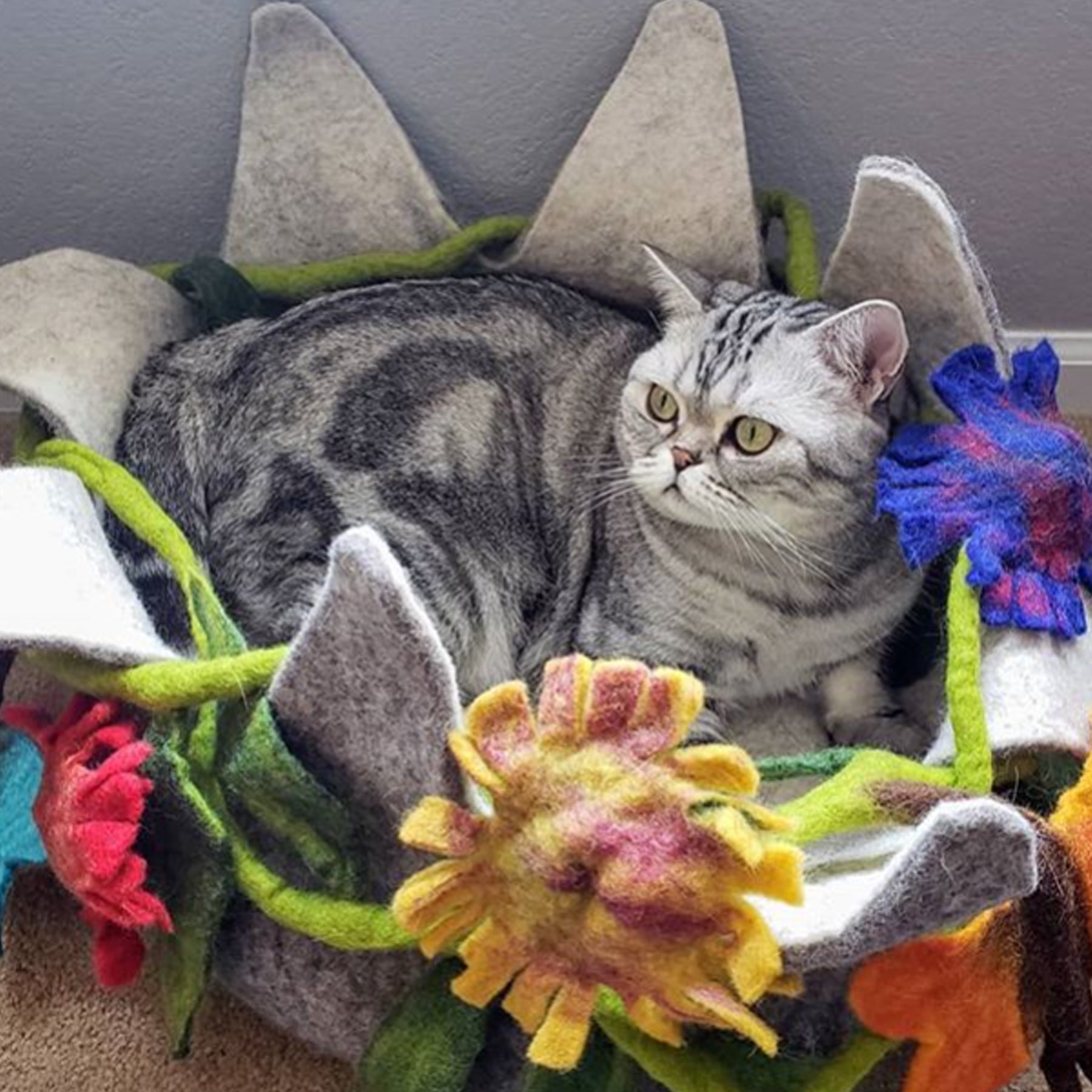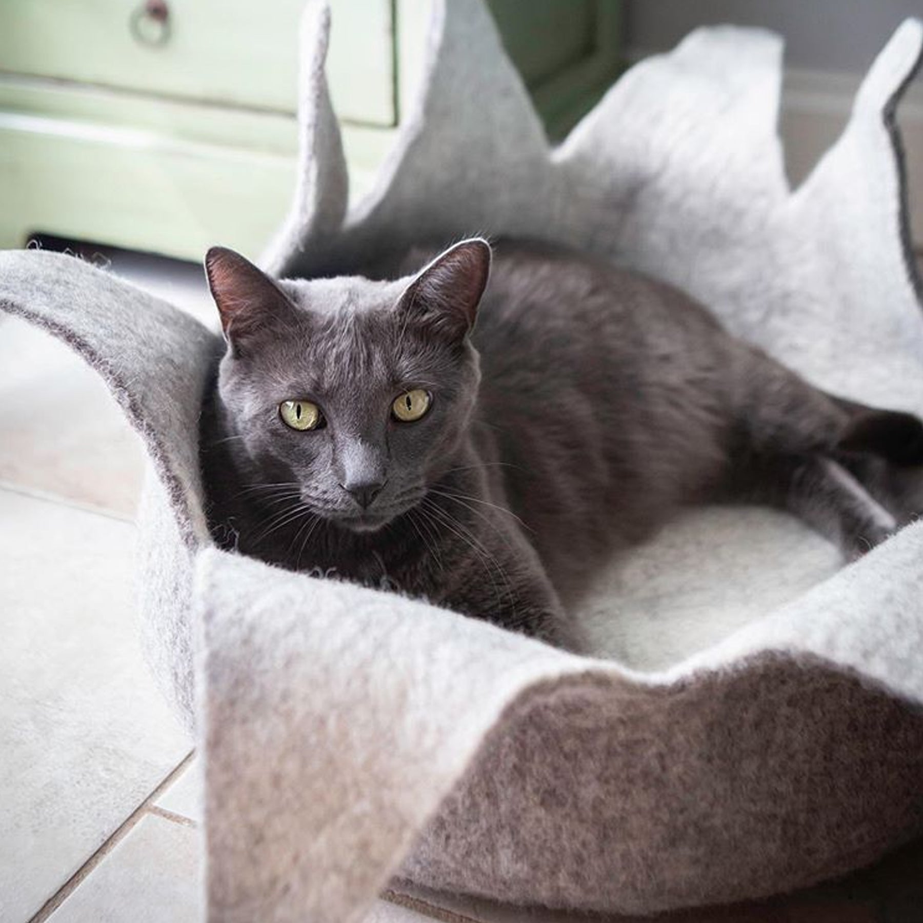 Our 14″ basket is great for cats and small dogs, up to 14 lbs. The roomy 20″ basket is perfect for larger pets, up to 25 lbs, or a couple of average size cats/toy dogs or a whole litter of kittens or puppies. Cats will have as much fun playing with their toys in it as sleeping. Our photographers gorgeous 16 lb cat is pictured in the 20″ basket. In the videos, our 6 lb. kittens Shimi and Momo play with their toys in the 20″ basket.