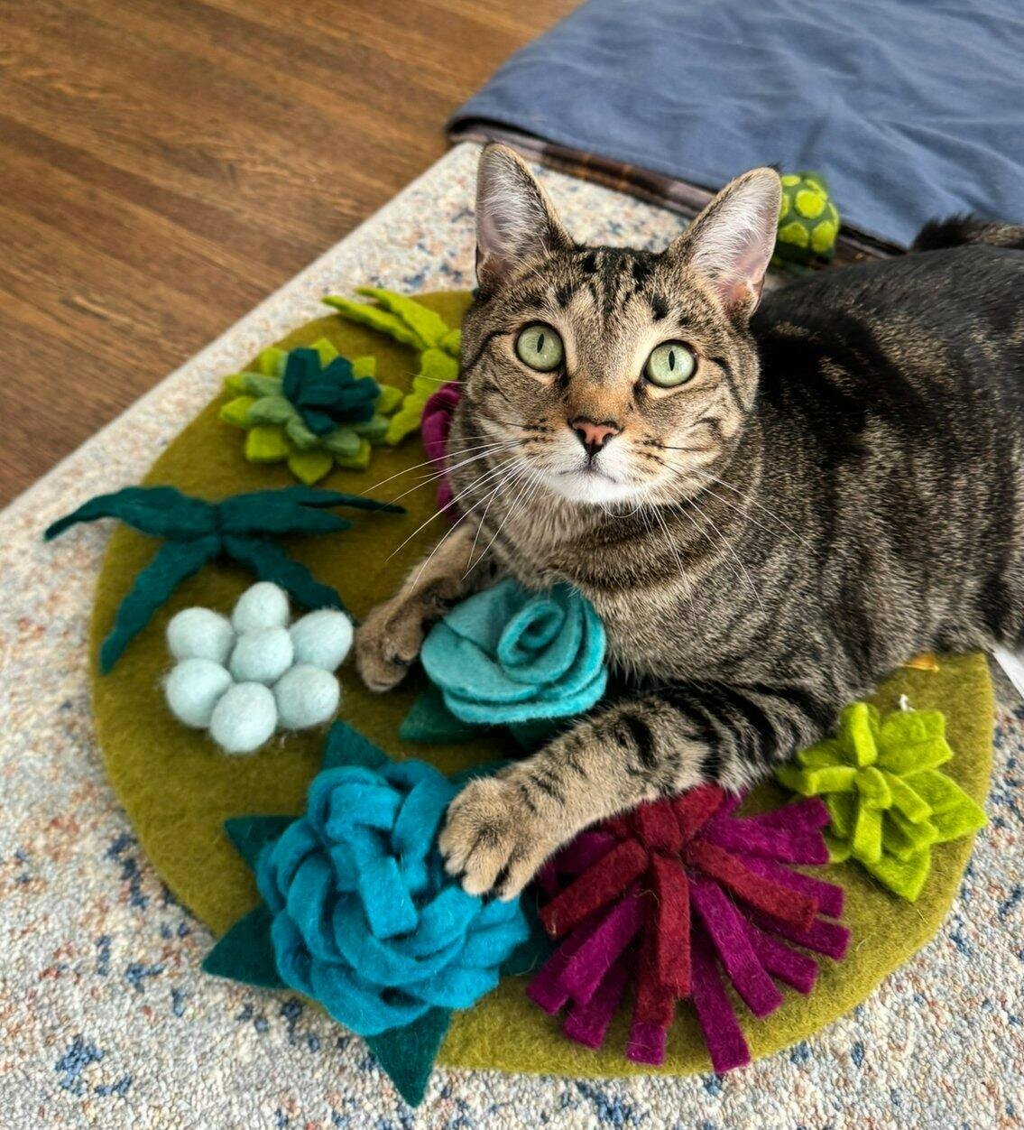 A soft desert bloom, built for play. This round mat features sculpted succulents in vibrant colors — layered petals, fuzzy textures, and gentle pockets tucked among leaves. At 14 inches in diameter, it’s just the right size for stashing treats or toys between blossoms, and letting your cat do what they do best: sniff, swat, and explore. It’s a felted take on a succulent garden — no watering required, but plenty of digging encouraged.